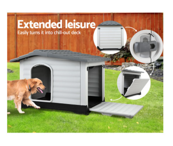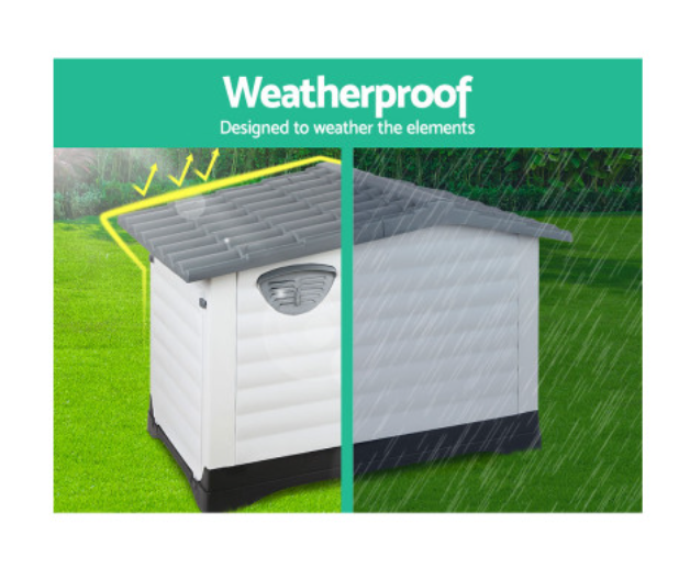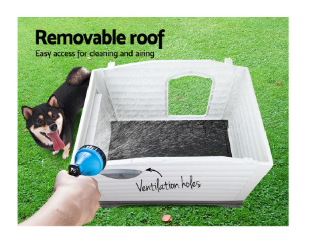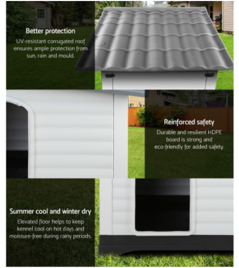 Besides being low maintenance, this delightful Dog Kennel is made from high quality and durable plastic to prevent germs and bacteria from nurturing inside. It's also designed with a corrugated roof for easy water runoff during the rainy season and an elevated base to keep your pet away from moist and damp grounds and surfaces.